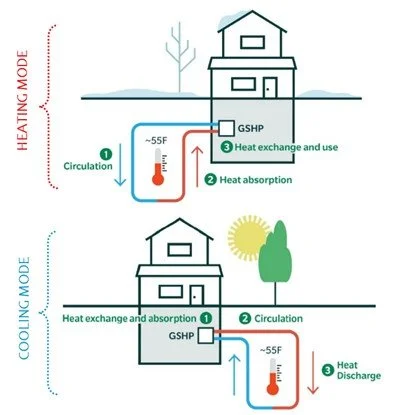 In HEATING MODE, these systems pull heat from the ground (Thermal Grid) to warm buildings. In COOLING MODE, they pull heat from buildings and push it back into the ground (Thermal Grid) to cool buildings.